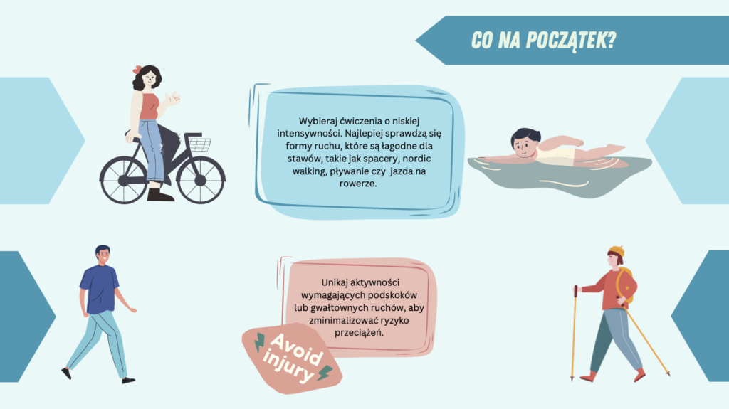 Wybieraj ćwiczenia o niskiej intensywności. Najlepiej sprawdzą się formy ruchu, które są łagodne dla stawów, takie jak spacery, nordic walking, pływanie czy jazda na rowerze.
